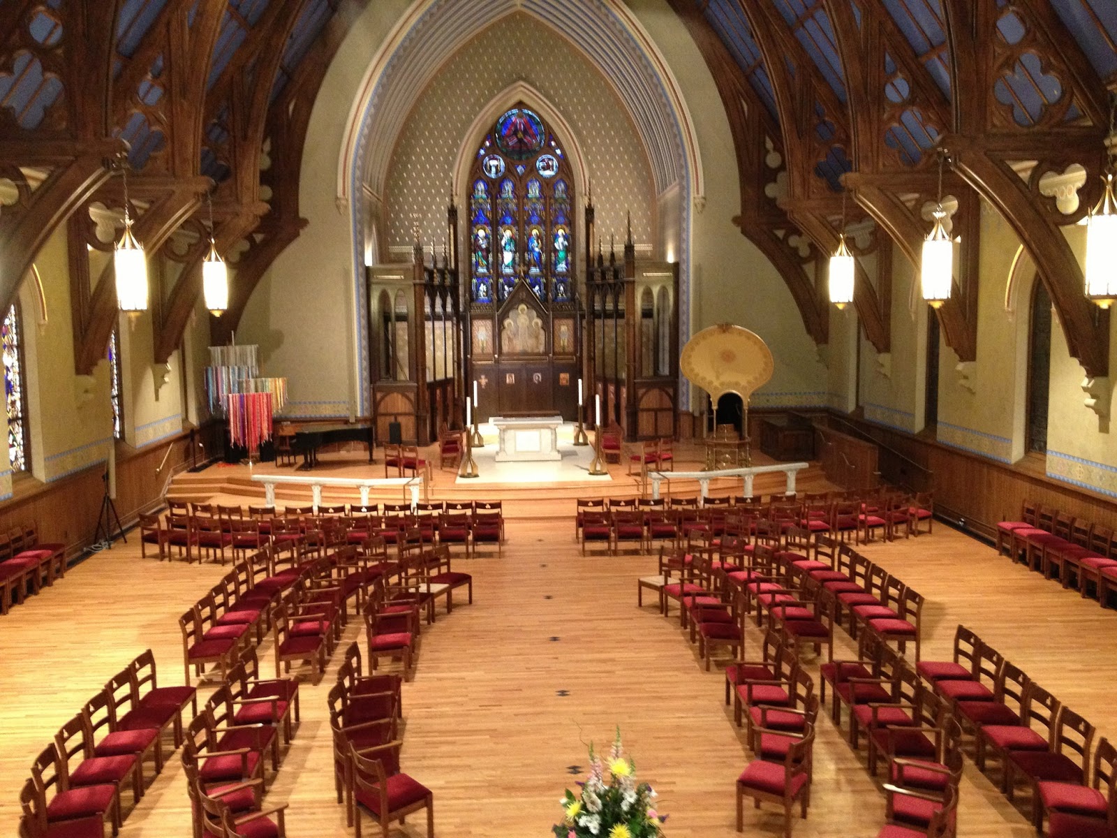 Overall, the lesson went well and it was a joy to play the pipe organ. The picture below was taken from the balcony just before my lesson began. As you may remember, the organ at Trinity Episcopal Church is in the balcony. This is the organist’s view of the nave from the balcony.