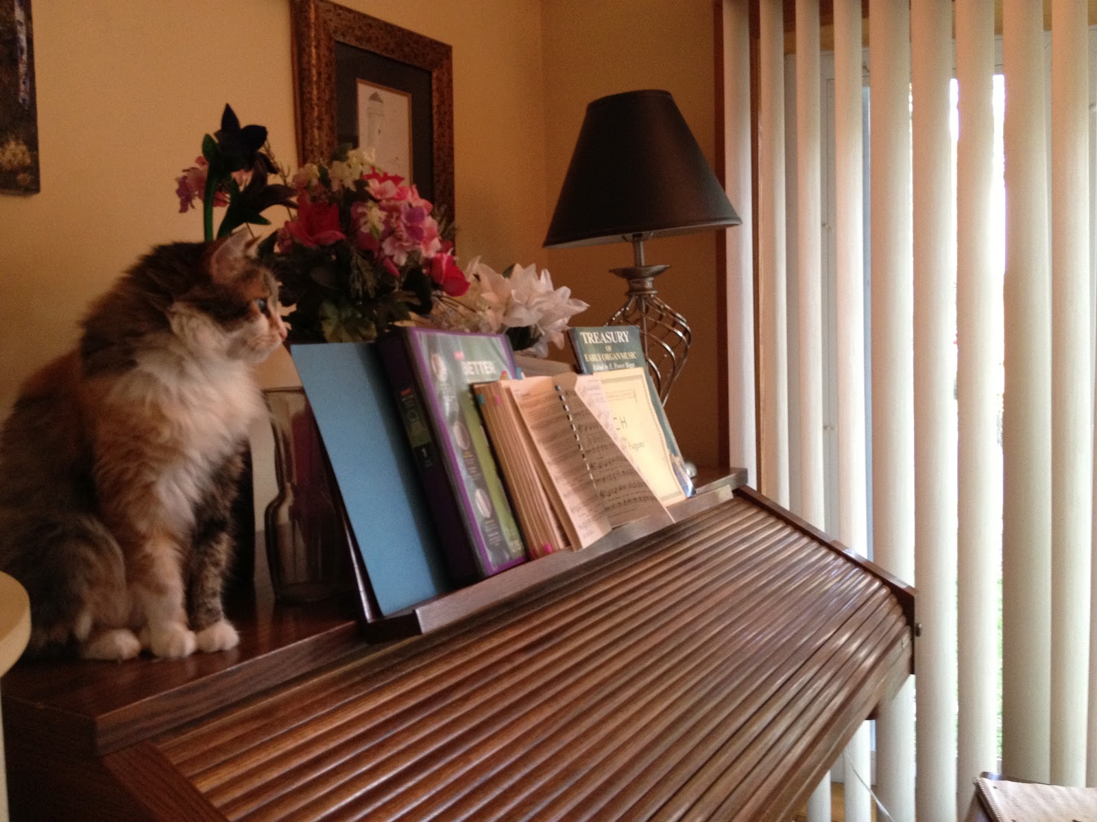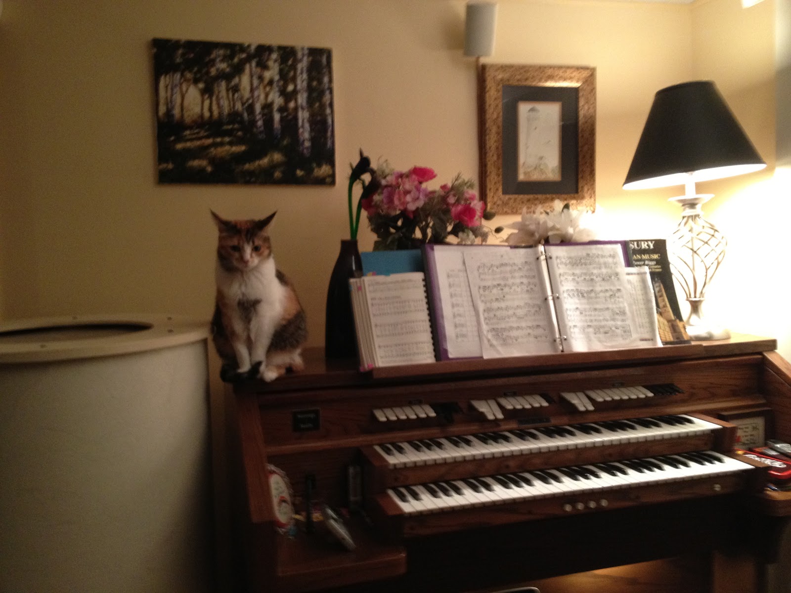 | Kilala on organ watching as I practice. |