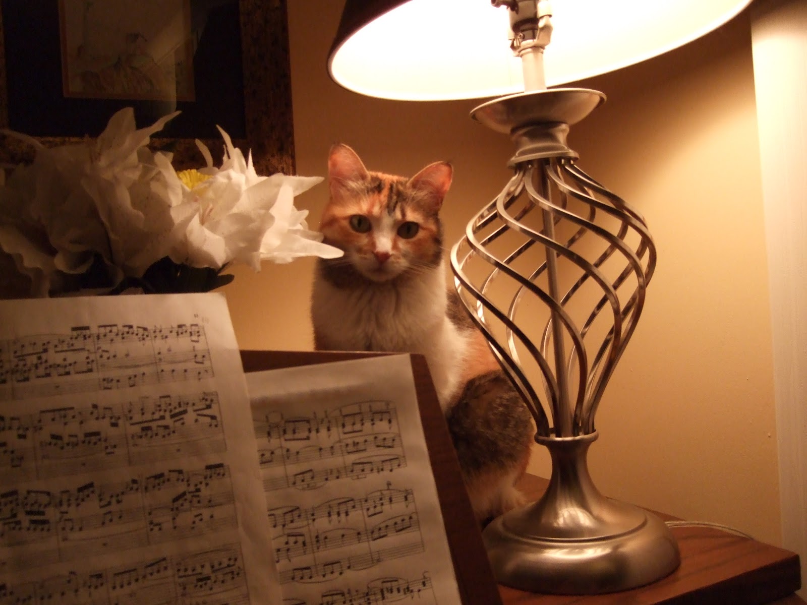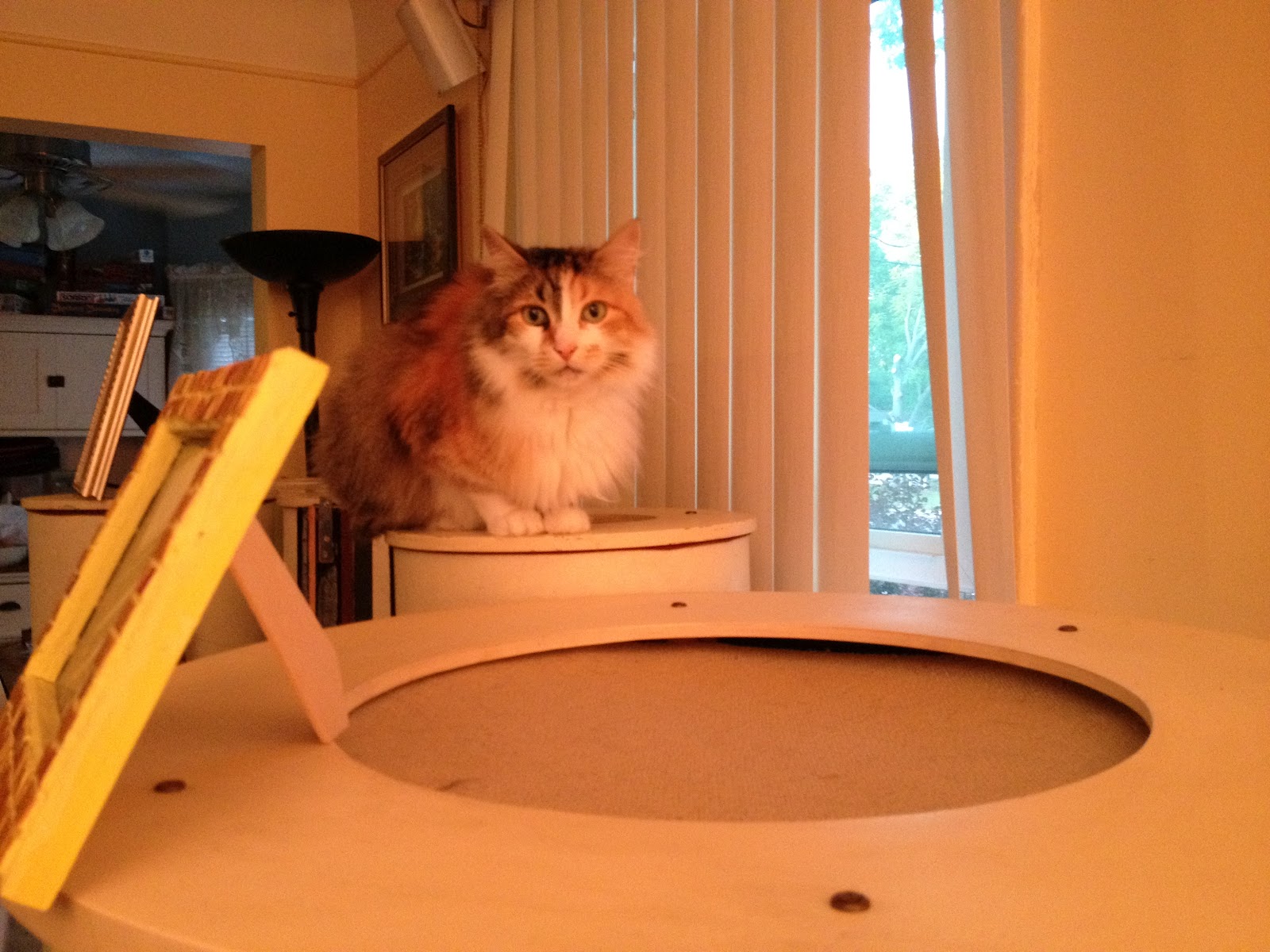 | Lina on organ speaker. A few days after this was taken she knocked yellow picture frame in this photo off the speaker which broke the frame and the glass! |