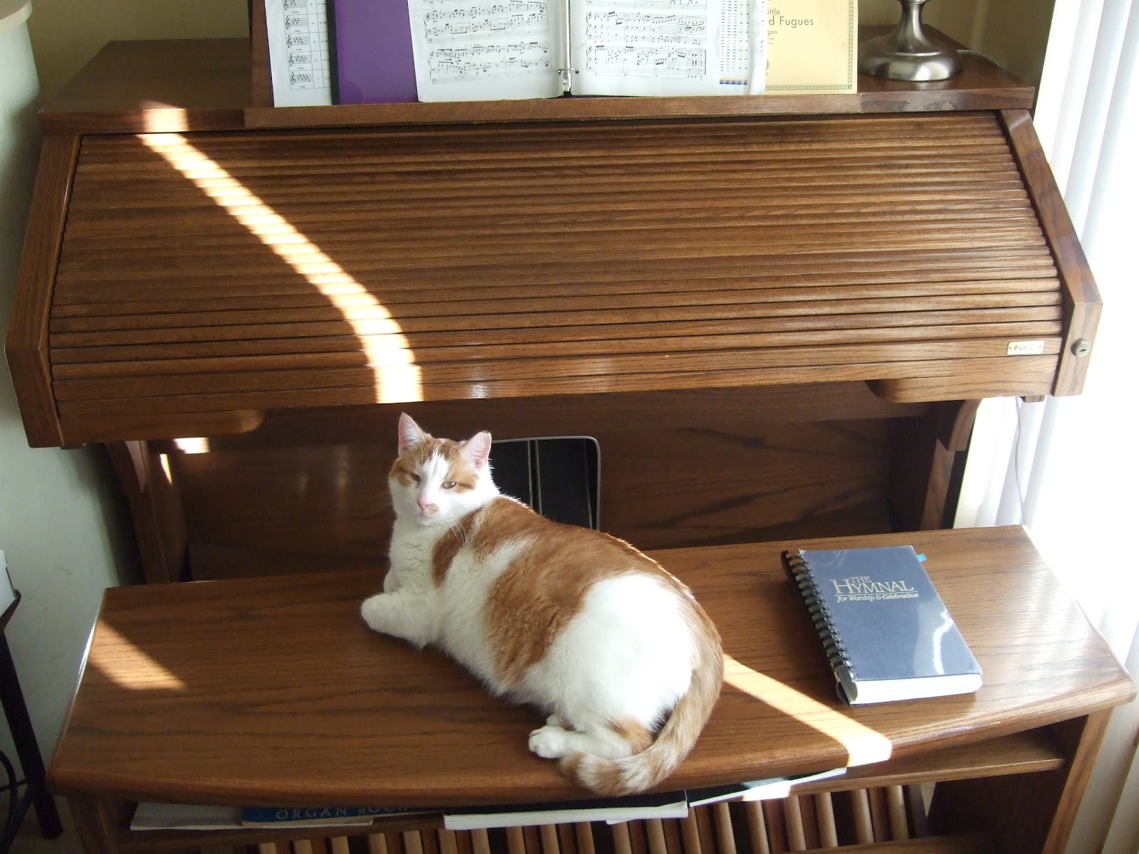 Pictured below is my cat, Buster. He was sleeping on the organ bench one sunny afternoon until I came along with my camera!